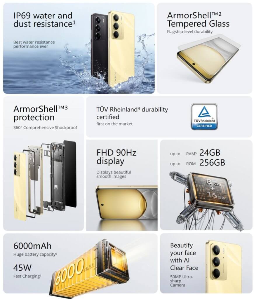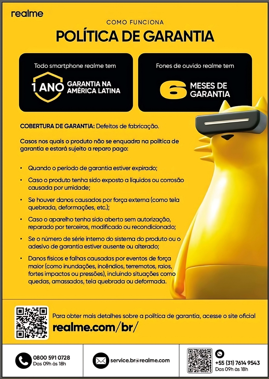 Certificações: Com IP69 e MIL-STD-810H, o Realme C75 oferece resistência a água, poeira e condições extremas, garantindo durabilidade.