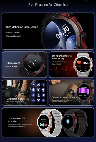 Notificações inteligentes (chamadas, mensagens de texto, Gmail e notificações de aplicativos para smartphones), Sincronização do clima (verifique o clima nos próximos quatro dias), Controles de música e câmera do smartphone, Encontre meu telefone e relógio, Modos Não perturbe, Alerta sedentário. Calculadora, Senha, Download de APP.