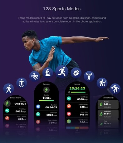 Monitoramento de saúde: frequência cardíaca no pulso (constante, a cada minuto), frequência cardíaca diária em repouso, alertas de frequência cardíaca anormal, medição do nível de SpO2 (oxigênio no sangue), pressão arterial, relaxamento, monitoramento do ciclo, pontuação e insights do sono, monitoramento da queima de calorias.
